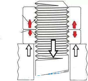 在施必牢螺母內(nèi)螺紋的牙底處有一個(gè)30度的楔形斜面,當(dāng)螺栓螺母相互擰緊時(shí),螺栓的牙尖就緊緊地頂在施必牢螺紋的楔形斜面上,從而產(chǎn)生了很大的鎖緊力。由于牙形的角度改變,使施加在螺紋間接觸所產(chǎn)生的方向力與螺栓軸線成60度角,而不是像普通螺紋那樣的30度角。這就使得施必牢螺紋方向壓力遠(yuǎn)遠(yuǎn)大于扣緊壓力,因此,所產(chǎn)生的防松摩擦力也就必然大大增加了。