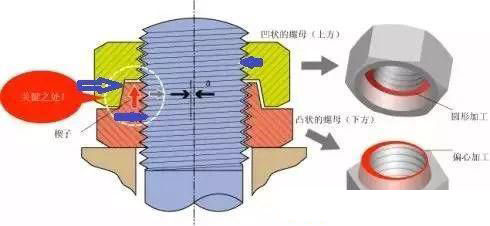 Hard lock 防松螺母是有上下呈“凹”“凸”形狀的兩種螺母組合成的。下方呈凸?fàn)畹穆菽?在加工時(shí)中心稍許錯(cuò)動(dòng)(偏心加工),起到楔子的作用。上方呈凹狀的螺母,則不作偏離中心的加工(圓形加工),于是形成了錘子揳打楔子的功能,上下螺母的“凸”面和“凹”面都是錐形面,這樣即使很小的軸向壓力,也可以產(chǎn)生很大的徑向壓力。“凸”“凹”錐面間的壓力會(huì)傳遞到上下螺母的咬合螺紋上,螺紋咬合面間和凸凹錐面上都會(huì)產(chǎn)生很大的摩擦阻力距,這樣起到防松的作用。