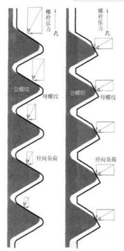 普通螺紋———60°角V形螺紋在其第一螺紋嚙合面和第二螺紋嚙合面承載了70%~80%的負(fù)荷,而以后幾個(gè)嚙合面承受的負(fù)荷很少。這樣一來(lái)普通螺紋緊固件在工作振動(dòng)負(fù)荷條件下,就很容易克服螺紋接觸面上的鎖緊力而產(chǎn)生轉(zhuǎn)動(dòng),進(jìn)而松脫,這就是普通螺紋緊固件松脫的原因所在。